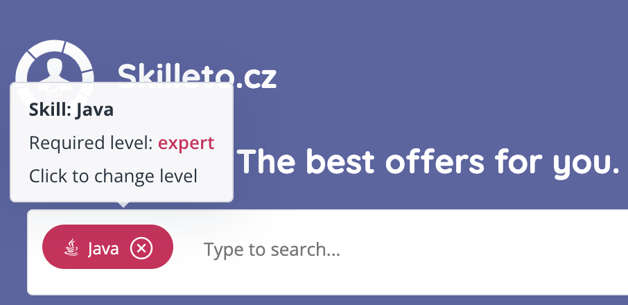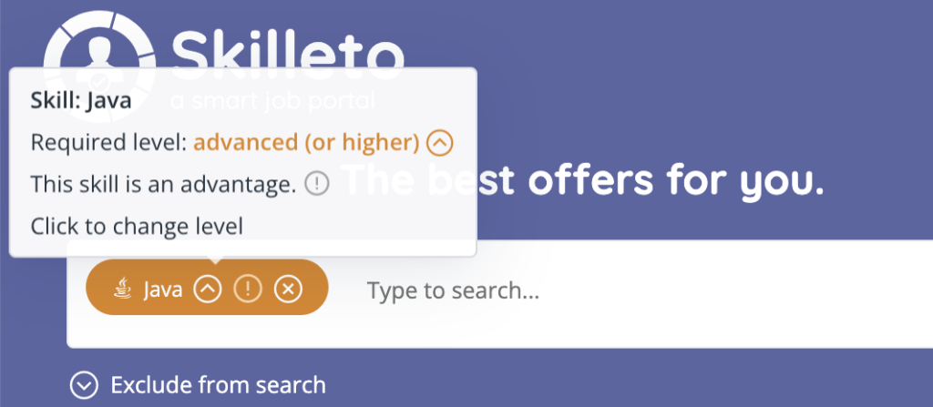 So far, quite a decent amount of possibilities 🙂 But let’s move it one level up! What do you think to be able to search for specific skill levels? Let’s say you want to find all the jobs where “Java” at the expert level is required. For Skilleto, this is a trifle 🙂 Of course, we can also search for everything that can have a set level (especially skills and languages). How? Tags in the search engine also act as buttons – simply click on the search criteria to set the exact level you want to search. Just like adding skills to a profile. It really couldn’t be easier.