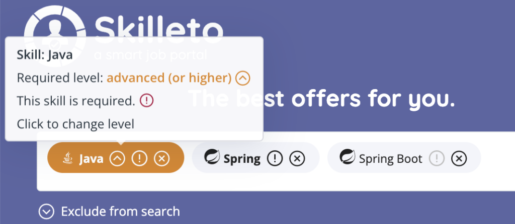 Well, a bonus at the end: “and what if I don’t want to look for something?”. For example: “I want to look for jobs where Javascript is required, but I definitely don’t want to come into contact with Java!” (note: randomly selected combination, please do not take it personally 😀 ). Even in this case, Skilleto will not leave you “in the lurch”.